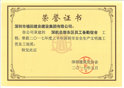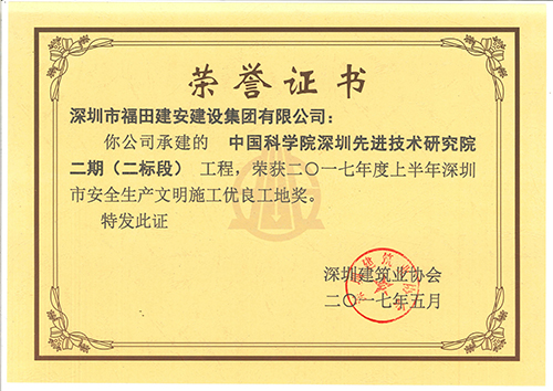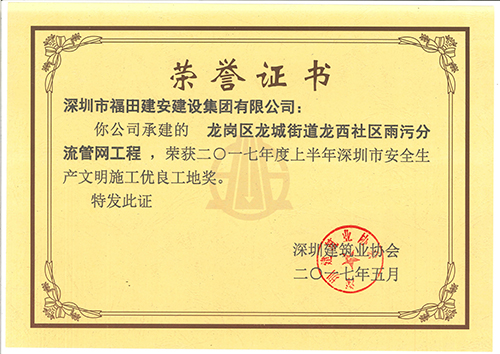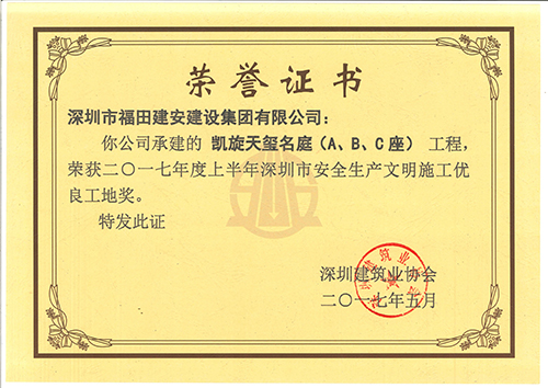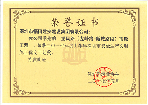 2017年上半年公司项目:《凯旋天玺名庭(A B C座)》《龙凤路(龙岭路-新城路段)市政工程》《龙岗区龙城街道龙西社区雨污分流管网工程》《中国科学院深圳先进技术研究院二期(二标段)》《深航总部东区员工备勤宿舍》获得深圳市安全生产文明施工优良工地。